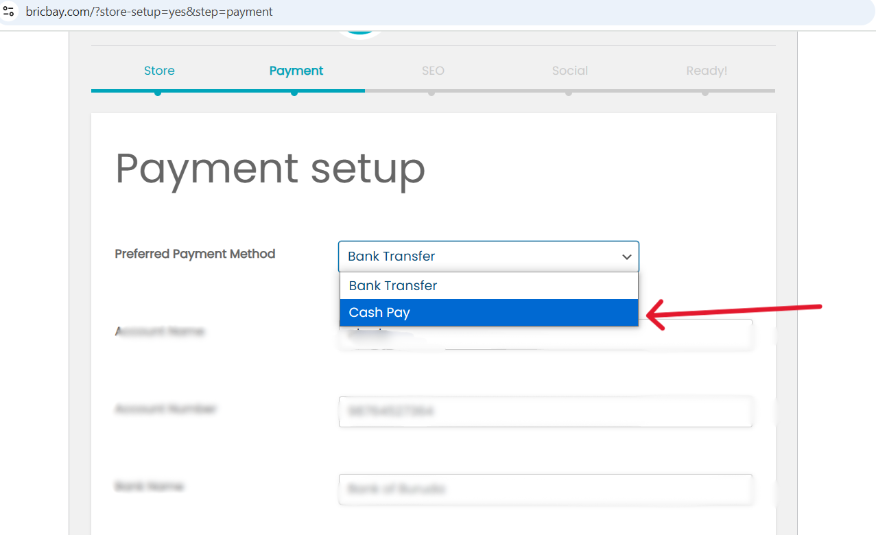 The second option for receiving payments is through cash. You can choose it from the Preferred Payment Method.