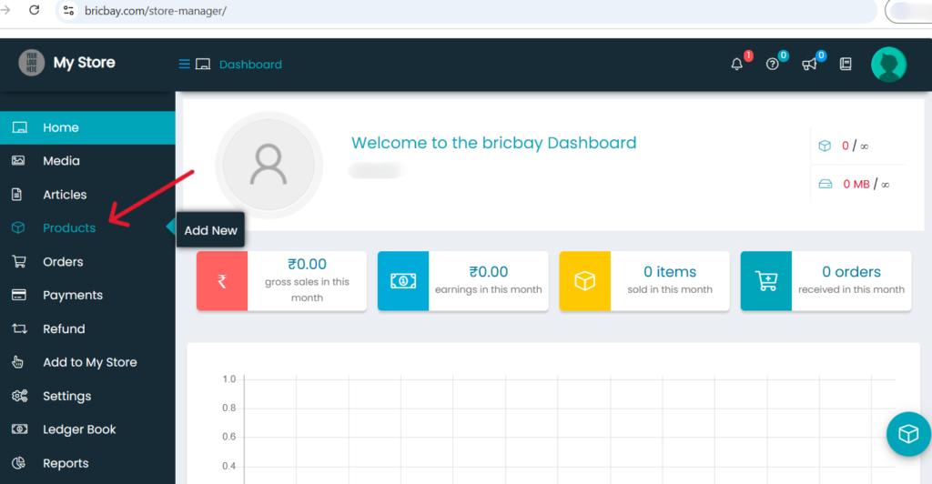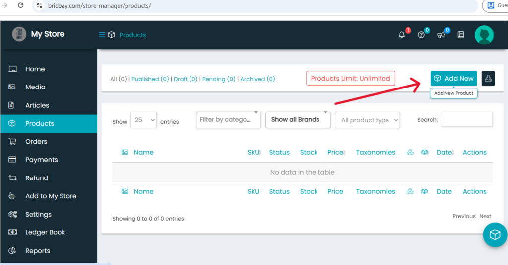 - Here you can see an option called “Add New” this is where you can add your products.