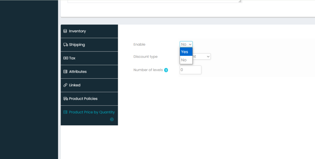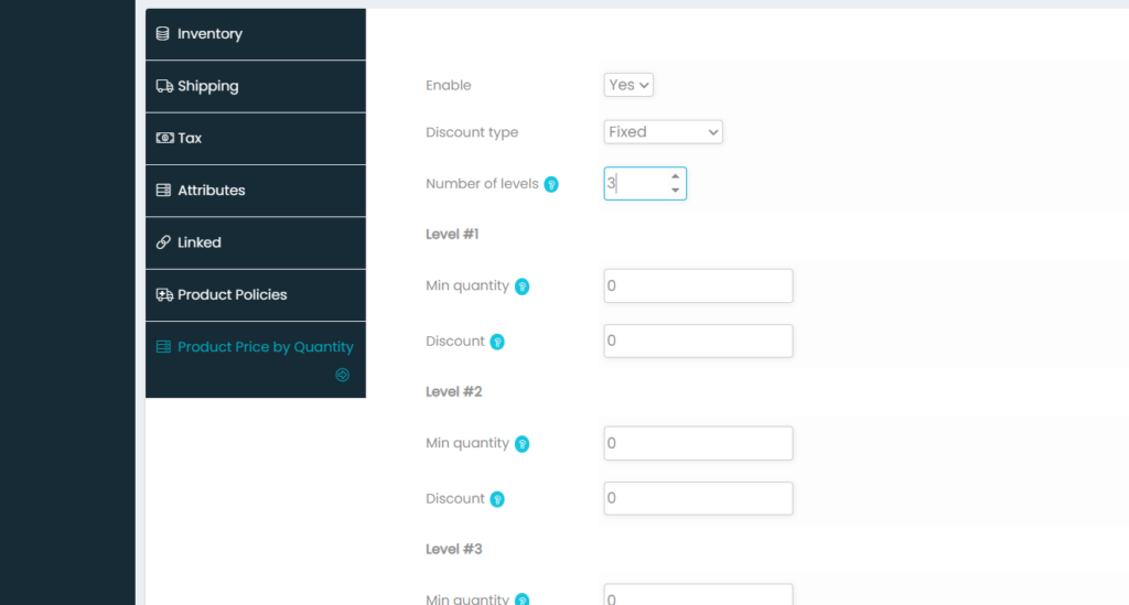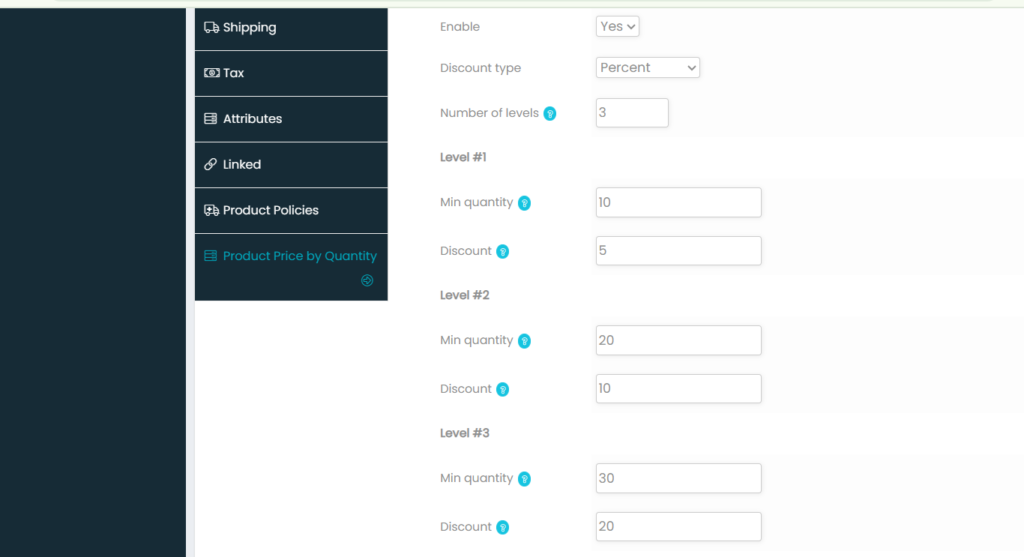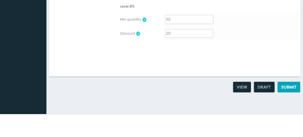 - Then mention the number of levels. The number of levels means the number of bulk quantites the prices vary (For Ex. if you mention number of level as 3 you need to enter 3 minimum quantities with their discount prices. Like for 10pieces price for each is Rs. 40 and for 20pieces price for each is Rs. 35 and for 30 & above pieces price for each is Rs. 30 etc.,)